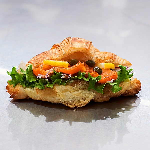 スモークサーモンをサワークリームとクロワッサンにサンドした定番の一品。